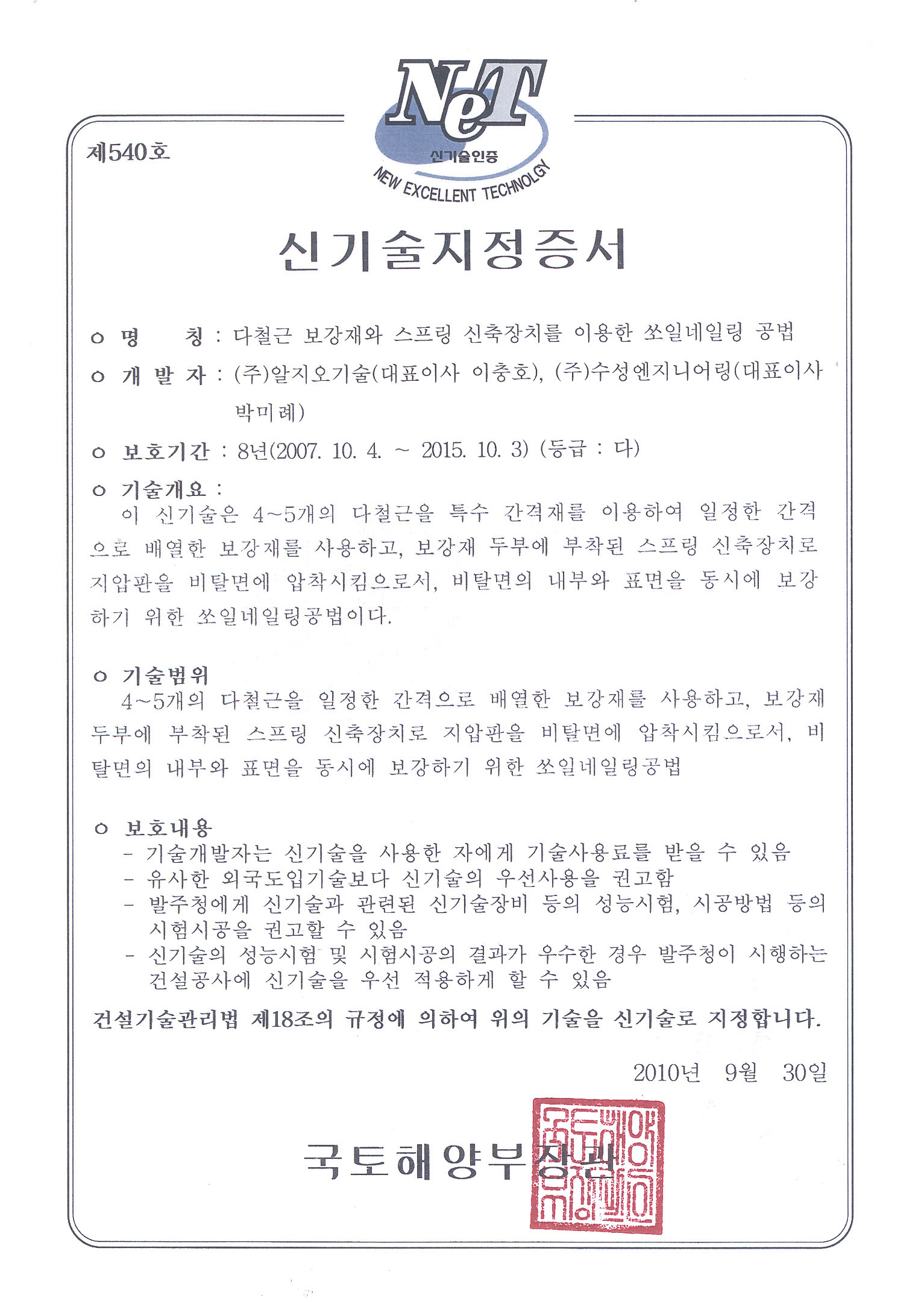 ◎ 개발자 : (주)알지오기술, (주)수성엔지니어링 ◎ 기술개요 : 이 신기술은 4~5개의 다철근을 특수 간격재를 이용하여 일정한 간격으로 배열한 보강재를 사용하고, 보강재 두부에 부착된 스프링 신축장치로 지압판을 비탈면에 입착시킴으로서, 비탈면의 내부와 표면을 동시에 보강하기 위한 쏘일네일링공법이다. |